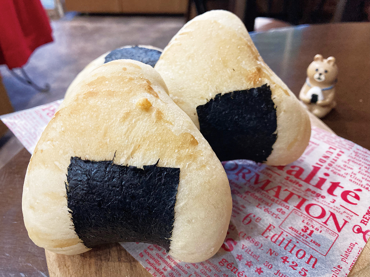 バター入りフランスパンの焼き上がりに醤油をかけて仕上げたおにぎりパンは、ハイカラ好きの信長をイメージ。確実に焼き立てを手に入れるなら、予約がおすすめです。