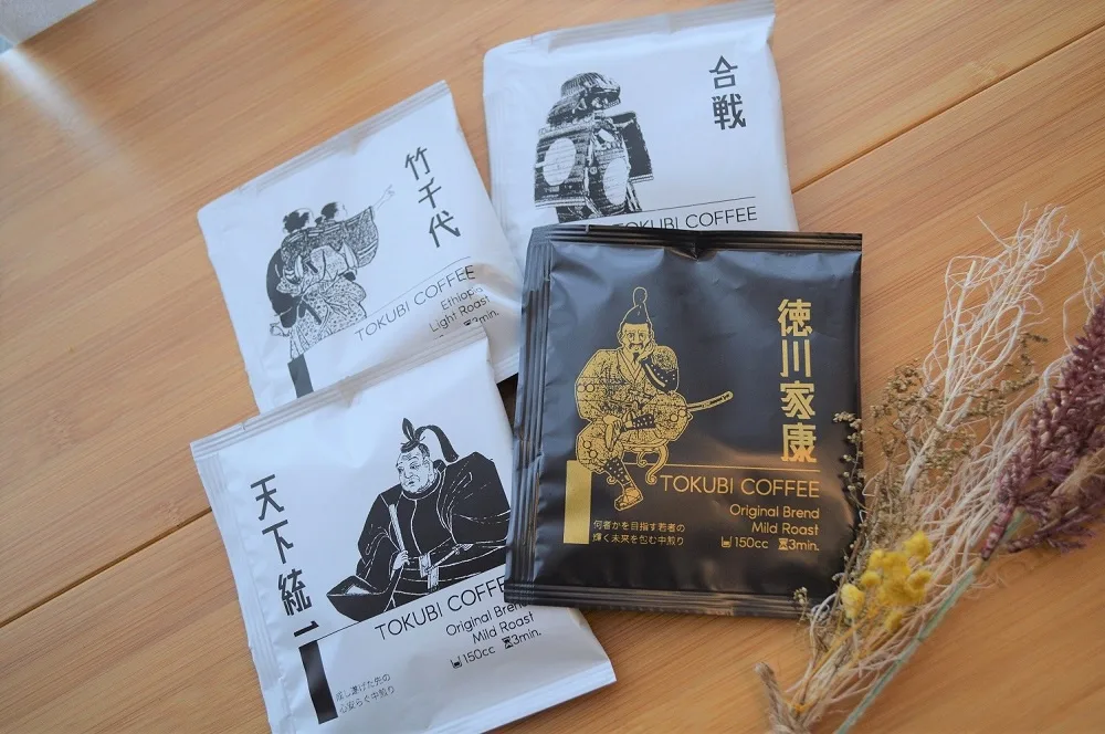 一宮市にあるコーヒー専門店のBASE COFFEEが手がけ、徳川家康の一生を表現したコーヒーバッグ。「竹千代」として過ごした幼少期から天下統一に至るまで、4種類を飲み比べながら、家康の人生に思いを馳せてみては。