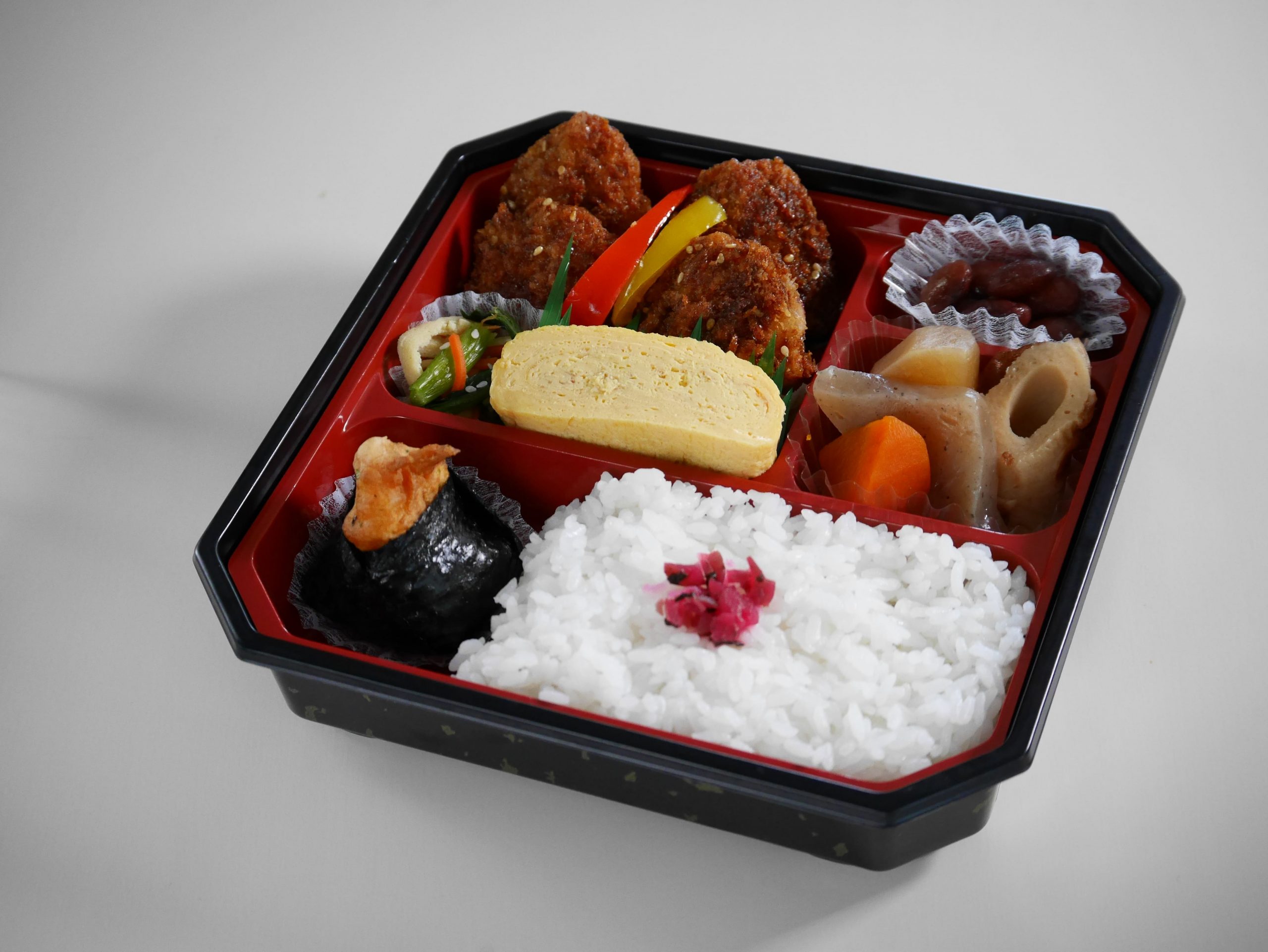 自家製ごま味噌がたっぷりとかかった三元豚ヒレカツと、「黄金夢天むす」を楽しめる弁当です。水の都・大垣の湧き水で炊き上げた、美濃名産の米「はつしも」を使った炊き込みごはんの天むすが絶品。