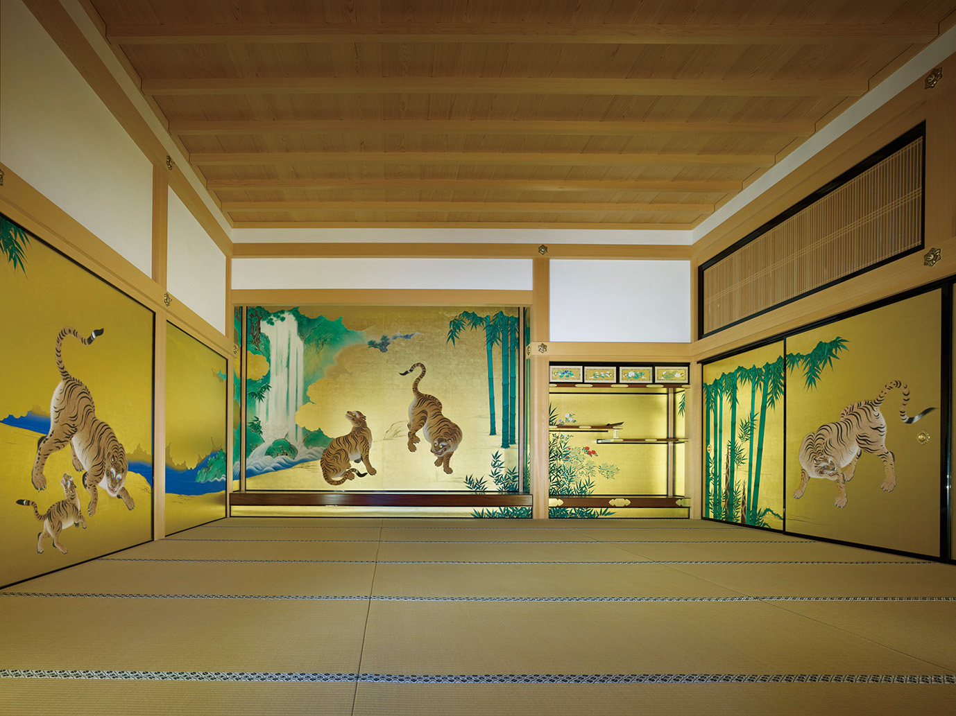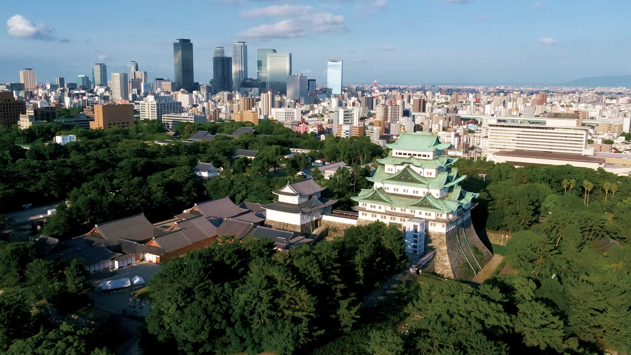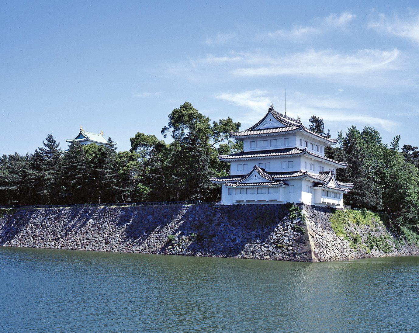 関ヶ原の戦いに勝利した徳川家康が西国に対するにらみと備えを目的に築いた巨大城郭。広大な石垣と堀で区切られた各曲輪を交互にずらした巧みな縄張※1を特徴とする。家康は築城と同時に城と熱田湊を結ぶ運河である堀川※2 の開削を福島正則に命じた。築城に必要な木材は堀川によって運ばれ、その後も城下町の発展に大きく寄与した。金鯱を載せ、屋根を銅瓦 で葺いた天守は、延床面積では江戸城天守をしのいでいた。戦災で焼失したが昭和 34 年(1959)に再建。平成 30 年(2018)に復元された本丸御殿は城郭御殿建築の最高傑作とされ、将軍上洛時の宿殿(御成御殿)※3として利用された。現在、二之丸庭園の整備が進行している(天守閣は現在閉館)。