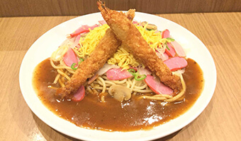 名古屋めしの代名詞・あんかけスパゲッティの元祖店では、あんかけスパゲッティの王道「ミラカン」をベースに、信長の戦いの象徴である鉄砲をイメージした海老フライをトッピング。インパクト大のメニューです。