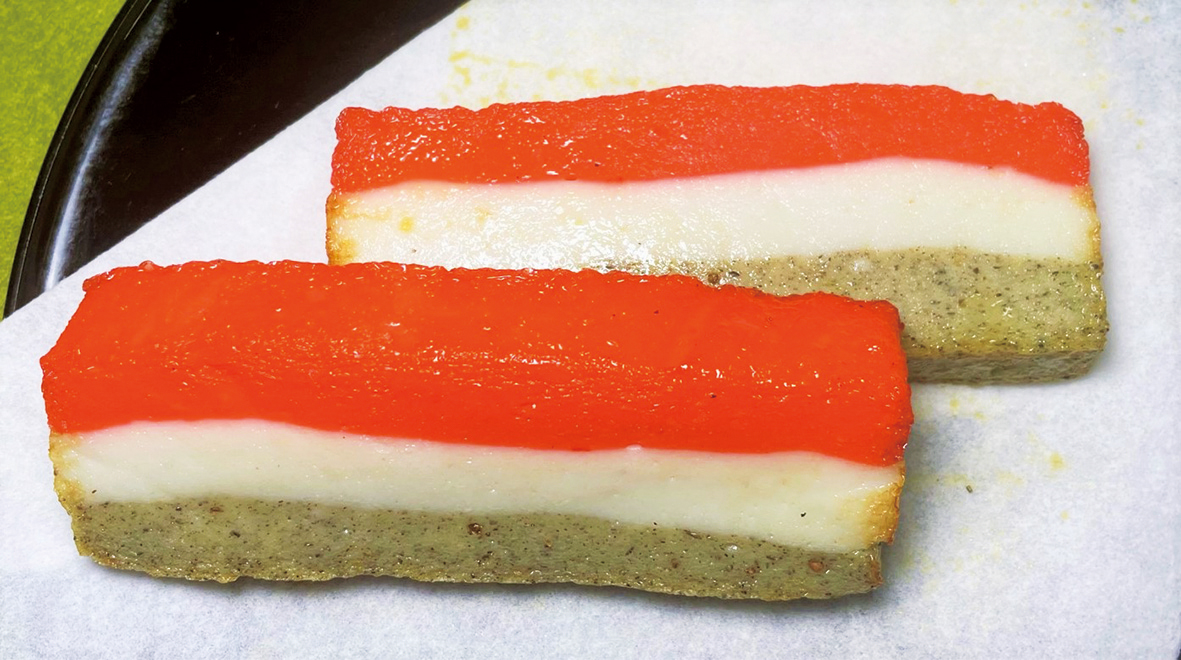 桶狭間の戦いでは熱田神宮で先勝祈願し、今川義元に大勝利を納めた信長。そのお礼に建造され、日本三大土塀ともいわれる信長塀を再現した蒲鉾は、蜂蜜の甘みを、妙香園のほうじ茶の香りと味で包みこんだ新食感が魅力です。