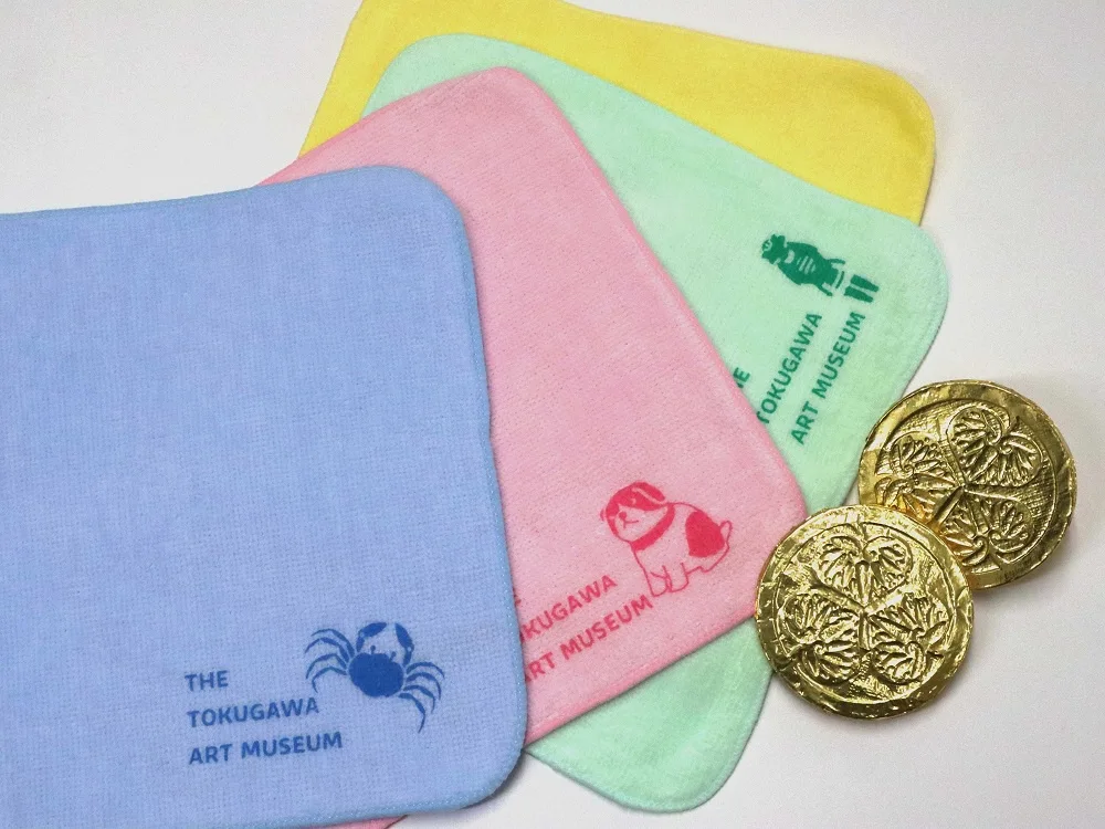 徳川家の家紋が金色に輝く包みの中に、圧縮されたハンカチが入っています。水に浸すことでミニハンカチになり、持ち歩きに便利。徳川美術館に所蔵されている作品がワンポイントにあしらわれ、色とデザインは4パターン。