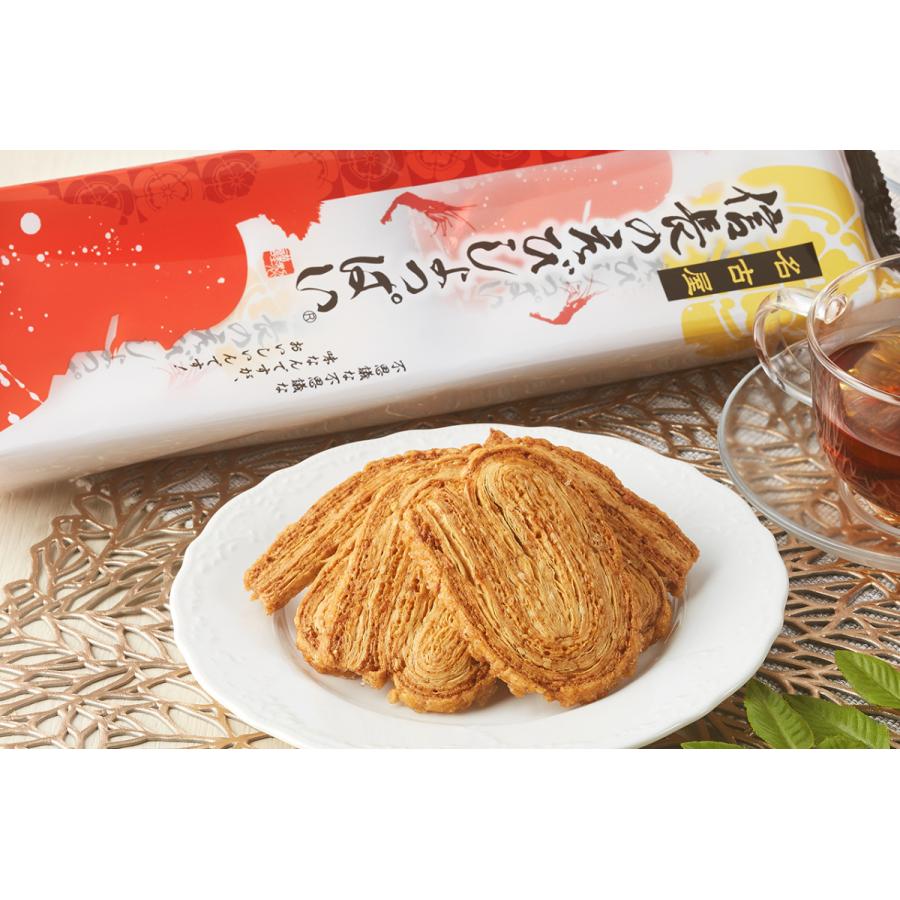 「パイ」でありながら「せんべい」のような食感と、不思議な感覚がクセになるお菓子。香ばしい海老の風味と砂糖の甘味、そして“しょっぱさ”の組み合わせによる独特の味わいが堪能できます。おやつやお酒のおつまみにもおすすめです。
