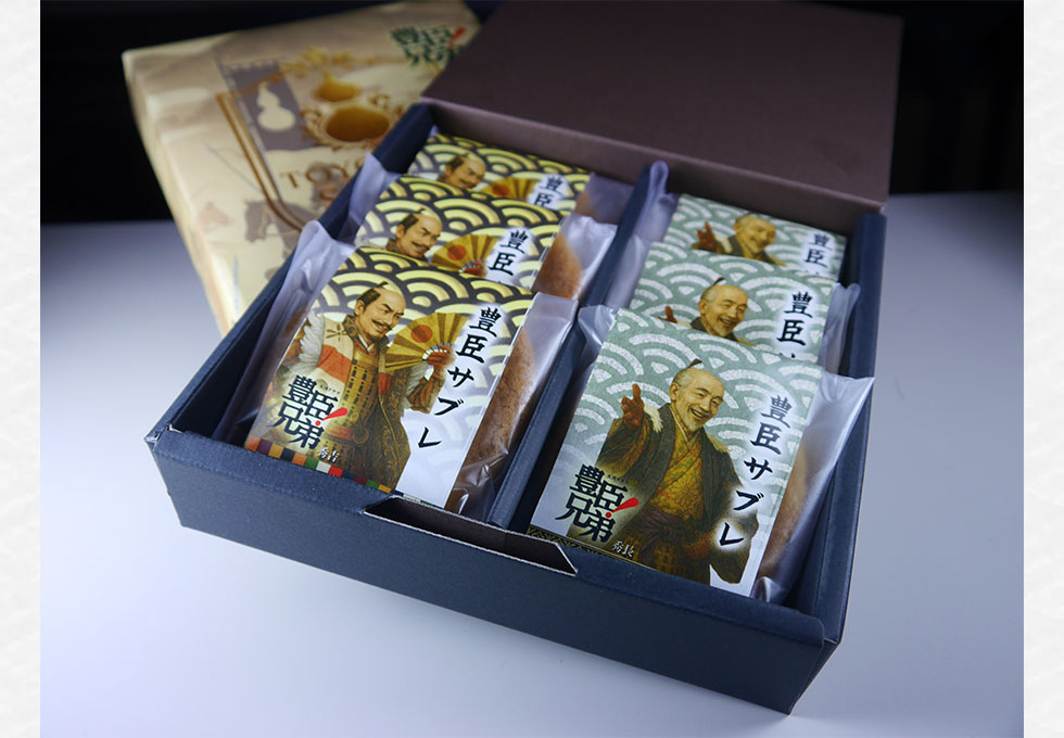 秀吉、秀長の2種のソフトサブレには、チョコレートと羽二重餅の2種類が入っている