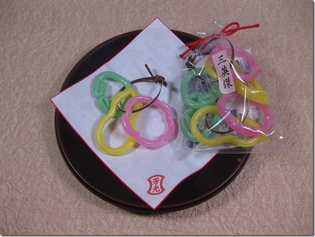 水飴と砂糖で作られるカラフルな有平糖を、昆布で結んだお菓子です。桃色は織田家の「織田木瓜」、黄色は豊臣家の「千成瓢箪」、緑色は徳川家の「徳川葵」と、各武将の家紋や馬印を模しています。