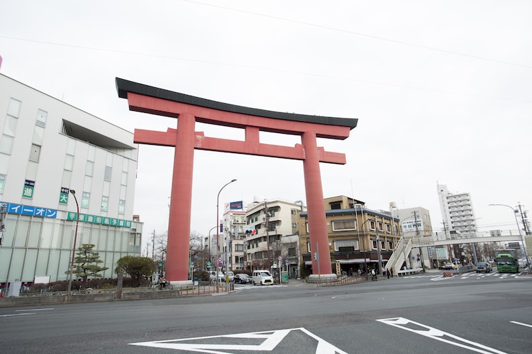地下鉄東山線中村公園駅の真上に立つ、高さ24.2m、柱直径2.4mの巨大な鳥居。中村が、名古屋市に編入されたのを記念し、昭和4年(1929年)に建てられました。中村公園に続く参道の入口にあります。