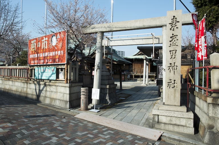 素盞男尊(スサノヲノミコト)を御祭神にお祀りする神社です。商売繁昌、家内安全を祈願する11月の祭事酉の市(おとりさま)は開運の熊手、福招きの箕、宝船などを求める参拝者で深夜から賑います。
