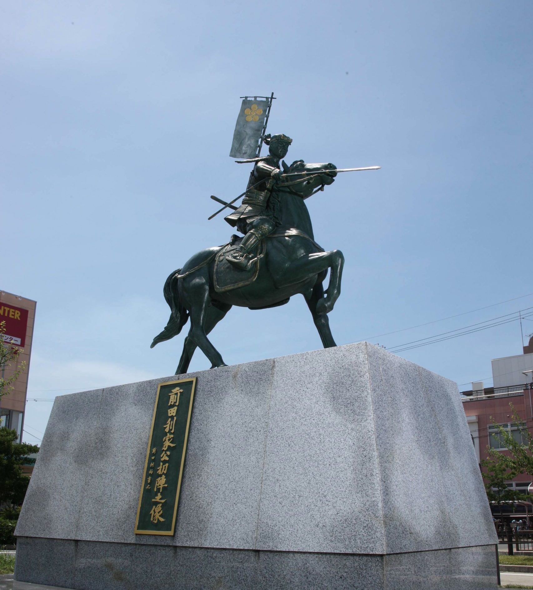 あおなみ線荒子駅前に馬上で槍をふるい出陣する若き前田利家の初陣の像とそれを見送るまつ像が建つ。利家は信長に従い、15歳の時に萱津合戦(愛知県あま市)で初陣を果たした。