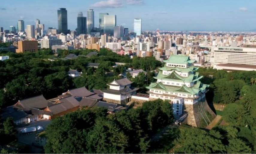 徳川家康が西国に対するにらみと備えを目的に築いた巨大城郭。中心部は総石垣造りで、防御機能に優れた枡形門を持つ。金鯱を載せ、屋根を銅瓦で葺いた天守は、延床面積では江戸城天守をしのいでいた。戦災で焼失したが昭和34年(1959)に再建。平成30年(2018)に復元された本丸御殿は城郭御殿建築の最高傑作とされ、将軍上洛時の宿殿(御成御殿)※として利用された。